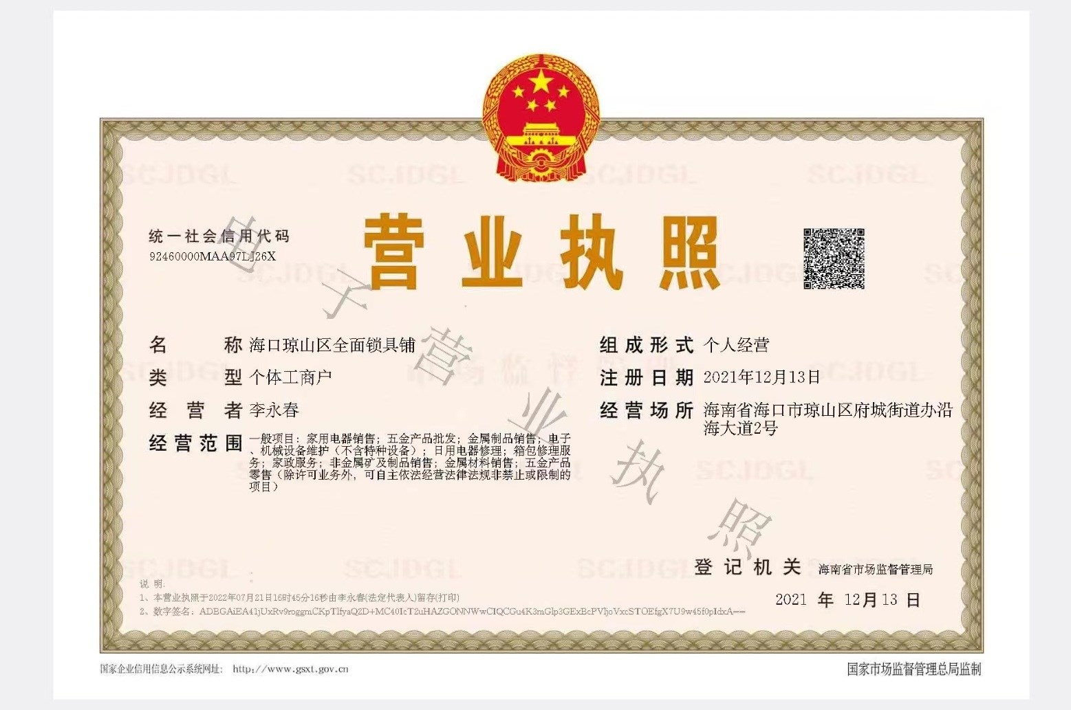 海口瓊山區全面鎖具鋪是經工商注冊、公安備案、稅務登記的合法鎖具開修服務單位。是專業開鎖、換鎖及配鑰匙、汽車芯片遙控鑰匙匹配等業務為一體的專業鎖具安防公司。從事開修鎖行業多年,有著非常豐富的開修鎖經驗。對各種進口鎖、 國產鎖、高級汽車鎖、防盜門鎖、各種檔案箱、文件柜、保險柜等當你遇到問題時提供合法有效的證明都能開啟,對各種轎車鎖、汽車鎖、保險柜出現的各類疑難、奇特故障都能及時修好,以自己熱心細致的服務和精湛的技術贏得了廣大客戶的一致好評。明碼標價,安全放心。宗旨為每一位顧客提供專業、高效、可靠的上門服務,保障用戶享受到卓越、全面的“端對端”尊貴服務。